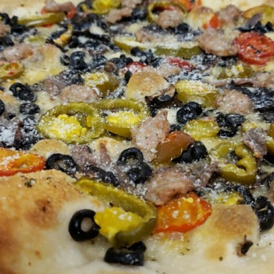 "Old Style" White Pizza Seasoned olive oil white base blend topped with romano cheese, hot peppers, onion, mushroom, sausage, black olives, anchovies. More Medium $20.45 Large $23.95 Half Tray $23.95 Full Tray $39.95