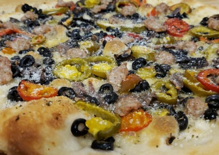 Seasoned olive oil white base blend topped with romano cheese, hot peppers, onion, mushroom, sausage, black olives, anchovies..